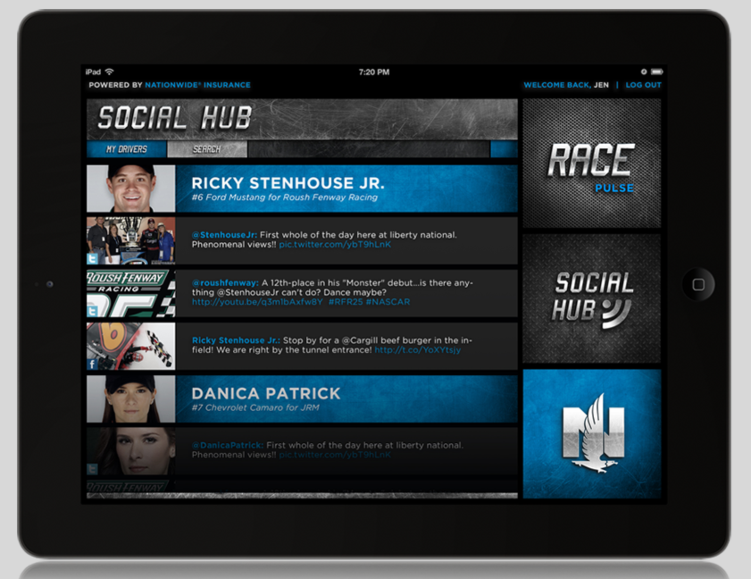 NASCAR fans love to drink up as much of their sport as possible. Yet a 500 mile race inevitably has some lulls in the action. That's why we designed this second screen tablet experience. It allows fans to follow the action, socialize and smack talk, look up terms, facts and results. And never have to turn off the action on the big screen.
